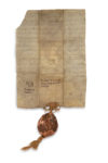 de chanvre; en latin. Donation par l'abbaye d'Anchin d'un autel à l'abbaye de Saint-Denis, mentionnant Suger. ALVISE (vers 1070-1148) fut prieur de l'abbaye Saint-Vaast d'Arras, et nommé en 1112 abbé de l'abbaye Saint-Sauveur d'Anchin (dans l'actuel département du Nord); nommé en 1131 évêque d'Arras, il prit part à la deuxième croisade avec Louis VII le Pieux, et mourut à Philippopolis (Plovdiv) en Thrace le 6 septembre 1148, soit un an après cette charte. Cette charte est citée par Dom Michel Félibien dans son Histoire de l'abbaye royale de Saint-Denys en France (Paris, Frédéric Léonard, 1706, «Recueil de pièces justificatives», pièce CXXXVII, page cvii). Alvise, évêque d'Arras, fait donation d'un autel au nom de l'abbaye d'Anchin, pour embellir l'église du bienheureux martyr Saint Denis, une des plus éminentes églises de la Gaule, que le frère SUGER contribue à agrandir et décorer. «In nomine Patris et Filii et Spiritus Sancti. A[men]. Ego Alvisus Dei miseratione Atrebatensis episcopus tam futuris quam praesentibus imperpetu[um.] Quoniam sacerdotali dignitati cedit, ad gloriam cunctis ecclesiis Dei servitio dedicatis omnem e[xhibere] diligentiam, nos qui Deo auctore pastorali cura praeminemus, oportunum est ut earum provectioni & decori pro viribus insistamus. Scientes igitur nobilissimam beati Dionysii martyris ecclesiam prae caeteris Galliae ecclesiis eminere, & abbatem ipsius decori domus Dei vigilanter insistere, ad amplificandum ejusdem ecclesiae decorem aliquid addere dignum decernimus, ut beneficiorum ejus participes nos constituamus. Proinde dilectissime frater Sugeri venerabilis Abba praedictae ecclesiae, pro animae nostrae, praedecessorumque nostrorum bonae memoriae Lamberti & Roberti, salute, altare de Annechin tibi tuisque successoribus perpetuo tenendum concedimus, ut inde luminare ecclesiae vestrae splendidius augeatur, & ante beatorum martyrum corpora sine intermissione ardente cereo, honor eorum solempnior habeatur, salvo in omnibus jure Atrebatensis episcopi & ministrorum ejus. Si quis autem post hanc nostram diffinitionem manu sacrilega ab ecclesia cui Deo disponente annuimus, auferre temptaverit vel ingeniosis machinamentis contra ea ire praesumpserit, cum Symone mago anathema sit. Nos siquidem hujus paginae auctoritatem ratam & stabilem permanere volentes, in praesentia subscriptorum testium eam confirmavimus. S. Domni Lucae Atrebatenfis Archidiaconi. S. Hugonis Ostrebandensis Archidiaconi. S. Nicholai Decani. S. Frumaldi Scolaltici. S. Rollandi Sacerdotis. S. Adae Diaconi. S. Roberti & Guidonis Subdiaconorum. Ego Alvisus Dei miseratione Atrebatenfis Epifcopus hoc libertatis donativum relegi, subscripsi, & in nomine Patris, & Filii, & Spiritus Sancti propria manu confirmavi. Actum Atrebati anno Dei Christi MCXLVII. Indictione IX. Anno autem Pontificatus Domni Alvisi Atrebatensis Episcopi XVI.» Le sceau pendant représente l'évêque Alvise en majesté. Il est bien conservé, malgré les bords émoussés.CHARTER of ALVISE, bishop of ARRAS, 1147. Charter on parchment, Arras 29 April 1147; parchment 26 x 18.5 cm (missing upper right corner removing the end of 3 lines), red-brown wax seal in shuttle form (6 x 5.5 cm approx.) hanging on hemp cords; in Latin. Donation by the abbey of Anchin of an altar to the abbey of Saint-Denis, mentioning Suger ALVISE (c. 1070-1148) was prior of the abbey of Saint-Vaast in Arras, and appointed in 1112 abbot of the abbey of Saint-Sauveur in Anchin (in the present-day department of Nord); appointed in 1131 bishop of Arras, he took part in the second crusade with Louis VII the Pious, and died at Philippopolis (Plovdiv) in Thrace on 6 September 1148, one year after this charter. This charter is quoted by Dom Michel Félibien in his Histoire de l'abbaye royale de Saint-Denys en France (Paris, Frédéric Léonard, 1706, "Recueil de pièces justificatives", pièce CXXXVII, page cvii). Alvise, bishop of Arras, donates an altar in the name of the abbey of Anchin, to embellish the church of the blessed martyr Saint Denis, one of the most eminent churches of Gaul, which Brother SUGER contributes to enlarge and decorate. "In nomine Patris et Filii et Spiritus Sancti. A[men]. Ego Alvisus Dei miseratione Atrebatensis episcopus tam futuris quam praesentibus imperpetu[um.] Quoniam sacerdotali dignitati cedit, ad gloriam cunctis ecclesiis Dei servitio dedicatis omnem e[xhibere] diligentiam, nos qui Deo auctore pastorali cura praeminemus, oportunum est ut earum provectioni & decori pro viribus insistamus. Scientes igitur nobilissimam beati Dionysii martyris ecclesiam prae caeteris Galliae ecclesiis eminere, & abbatem ipsius decori domus Dei vigilanter insistere, ad amplificandum ejusdem ecclesiae decorem aliquid addere dignum decernimus, ut beneficiorum ejus participes nos constituamus. Proinde dilectissime frater Sugeri venerabilis Abba praedictae ecclesiae, pro animae nostrae, praedecessorumque nostrorum bonae memoriae Lamberti & Roberti, salute, altare de Annechin tibi tuisque successoribus perpetuo tenendum concedimus, ut inde luminare ecclesiae vestrae splendidius augeatur, & ante beatorum martyrum corpora sine intermissione ardente cereo, honor eorum solempnior habeatur, salvo in omnibus jure Atrebatensis episcopi & ministrorum ejus. Si quis autem post hanc nostram diffinitionem manu sacrilega ab ecclesia cui Deo disponente annuimus, auferre temptaverit vel ingeniosis machinamentis contra ea ire praesumpserit, cum Symone mago anathema sit. Nos siquidem hujus paginae auctoritatem ratam & stabilem permanere volentes, in praesentia subscriptorum testium eam confirmavimus. S. Domni Lucae Atrebatenfis Archidiaconi. S. Hugonis Ostrebandensis Archidiaconi. S. Nicholai Decani. S. Frumaldi Scolaltici. S. Rollandi Sacerdotis. S. Adae Diaconi. S. Roberti & Guidonis Subdiaconorum. Ego Alvisus Dei miseratione Atrebatenfis Epifcopus hoc libertatis donativum relegi, subscripsi, & in nomine Patris, & Filii, & Spiritus Sancti propria 