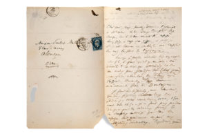 sur grand papier. Baudelaire parle tout d'abord d'un billet d'escompte qu'il a du mal à toucher, qui lui a été refusé deux fois, la seconde fois parce que «je suis allé comme un imbécile me casser le nez le jour de l'Ascension». Puis il en vient à son livre: «Pour que je puisse acheter des exempl. sur fil, il faut qu'il y en ait. Où sont-ils? Et moi qui attendais cela, au moins pour Grandguillot (chose grave)» [Grandguillot était directeur du Constitutionnel]. Il ira «chercher les Fleurs» [les poèmes pour la seconde édition des Fleurs du Mal, restés à Honfleur] après avoir réglé l'affaire Duranty... Poulet-Malassis devra désormais faire «comme tous les éditeurs: 1000 veut dire 1100, 1500 veut dire 1650. Il ne faut pas perdre d'argent par les cadeaux forcés. Et ce surplus autorisé par tous les usages doit être entièrement consacré aux obligations inévitables. Cependant, quand le tirage est de 6000 (6600), je n'ai pas la prétention de donner 600 exempl. [...] vous auriez dû prévoir le cas, et en faisant comme tout le monde, vous auriez évité de m'imposer une économie embarrassante». Il le remercie «pour le Chine; mais cela implique-t-il que je n'aurai pas de Hollande? [...] Je me résigne au malheur de Saint-Victor, de Gaiffe et de Du Camp. Mais Janin et surtout Grandguillot!»... Il signale une coquille page 14.L.A.S. "C.B", [Paris 18 May 1860], to his publisher Auguste POULET -MALASSIS in Alençon; 2 pages in-8, address with stamp (corner torn without loss of text). On the printing of Paradis Artificiels and the large paper copies. Baudelaire speaks first of a discount note that he had trouble getting, which was refused twice, the second time because "I went like a fool to break my nose on Ascension Day. Then he comes to his book: "For me to buy copies on the wire, there must be some. Where are they? And I was waiting for that, at least for Grandguillot (a serious matter)" [Grandguillot was director of the Constitutionnel]. He will go "to fetch the Flowers" [the poems for the second edition of the Fleurs du Mal, left in Honfleur] after having settled the Duranty affair... Poulet-Malassis will now have to do "as all publishers do: 1000 means 1100, 1500 means 1650. One must not lose money by forced gifts. And this surplus, authorized by all customs, must be entirely devoted to the inevitable obligations. However, when the circulation is 6000 (6600), I do not pretend to give 600 copies. [...] you should have foreseen the case, and by doing as everyone else does, you would have avoided imposing an embarrassing economy on me." He thanks him "for the China; but does that imply that I will not have any Holland? [...] I resign myself to the misfortune of Saint-Victor, Gaiffe and Du Camp. But Janin and especially Grandguillot!"... He points out a typo on page 14.