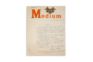 tint en février-mars 1955 au Musée Pédagogique. Il s'apprête à retourner à sa correspondante les épreuves du catalogue. Je ne puis éviter de rétablir une note qu'on a oublié de composer; j'espère que cela ne bouleversera pas la mise en pages, au cas contraire, je me résignerais à sacrifier la note (...). Il lui communique les adresses des trois principaux prêteurs de l'exposition, M. H.P. Roché, M. Edmond Bomsel et M. Robert Lebel. Il ajoute qu'il serait souhaitable que le Musée Pédagogique procède avec eux comme avec M. Tappenbeck. Vous devez avoir la désignation des oeuvres dont ils nous laissent disposer (...)» Edmond Bomsel fut un des propriétaires des Editions du Sagittaire fondées en 1919 par Simon Kra, qui publiera nombre de textes et ouvrages surréaliste; il fut aussi mécène de la galerie Gradiva qui ouvrit en 1937 sous la direction de Breton.L.A.S. Paris, January 26, 1955. 1 pp. in-4, on coloured headed paper "Who is Medium? (...) Centre d'informations surréalistes". About his collaboration in the exhibition "Perennité de l'Art gaulois" held in February-March 1955 at the Musée Pédagogique. He is about to return the catalogue proofs to his correspondent. I cannot avoid restoring a note that was forgotten; I hope that this will not upset the layout, otherwise I would resign myself to sacrificing the note (...). He gives him the addresses of the three main lenders of the exhibition, Mr. H.P. Roché, Mr. Edmond Bomsel and Mr. Robert Lebel. He adds that it would be desirable for the Musée Pédagogique to proceed with them as with Mr. Tappenbeck. You must have the designation of the works of which they let us have (...)" Edmond Bomsel was one of the owners of the Editions du Sagittaire founded in 1919 by Simon Kra, which will publish a number of surrealist texts and works; he was also a patron of the Gradiva gallery which opened in 1937 under the direction of Breton.