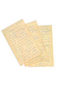intimes entre Céline et Paul Marteau: «Votre lettre nous arrive comme le petit Noël toute annonciatrice de temps nouveaux! Mille amitiés et voeux et reconnaissance!» Il réagit à un énième dossier du juge d'instruction: «Oh le document - massue ce doit être encore une blague - la1000eme! Un faux! Ou rien du tout! J'ai l'habitude mais la chiêrie c'est que l'élan est donné... même sur un dossier vide l'élan c'est tout! Il y a bien sur les comparaisons à établir entre la rage qui me poursuit et l'infinie indulgence du parquet envers tant de collaborateur illustres (voir le Dictionnaire des Girouettes)» [paru en 1948, était précédé de «L'oubli en politique»] «à moins d'être aveugle et sourd c'est difficile à digérer! Oh condamné je me plaindrai! Je ne bêlerai pas! Je suis toujours entendu par au moins500000 lecteurs - Dans le ‘gala' [des Vaches, journal tenu par Albert Paraz depuis 1947 et publié en 1948, constitué d'une grande correspondance croisée Céline-Paraz], je bêche les amitiés platoniques en vue de ne point avoir l'air protégé par personne. Absolument seul. Déjà les chacals reniflent et comment!». Céline demande à Marteau d'influencer André Marie, le Ministre de la justice. «Mais je voudrais bien qu'on cesse de me persécuter comme on le fait. Par sadisme, pour le plaisir - Qu'on me foute toutes les indignités qu'on veut! C'est moi le digne! Mais pas de tôle même par contumace».Autograph letter signed to Paul MARTEAU. Korsör (Denmark), January 25, 1948. 6 pages in-4 in blue ink on paper, envelope kept. Very friendly and warm letter, confirming the intimate links between Céline and Paul Marteau: "Your letter comes to us like a little Christmas, all heralding new times! A thousand friendships and wishes and gratitude! He reacts to the umpteenth file from the examining magistrate: "Oh the document - it must be another joke - the 1000th! A forgery! Or nothing at all! I'm used to it, but the bitchiness is that the momentum is there... even on an empty file the momentum is everything! There are comparisons to be made between the rage that pursues me and the infinite indulgence of the public prosecutor's office towards so many illustrious collaborators (see the Dictionnaire des Girouettes)" [published in 1948, was preceded by "L'oubli en politique"] "unless you are blind and deaf it is difficult to digest! Oh condemned I will complain! I will not bleat! I am always heard by at least 500,000 readers - In the 'gala' [of Les Vaches, a journal kept by Albert Paraz since 1947 and published in 1948, made up of a large cross-correspondence between Céline and Paraz], I spade out platonic friendships in order not to seem protected by anyone. Absolutely alone. The jackals are already sniffing around and how! Céline asks Marteau to influence André Marie, the Minister of Justice. "But I wish they would stop persecuting me as they do. For sadism, for pleasure - Let them do to me all the indignities they want! I am the worthy one! But no jail time, not even in absentia".