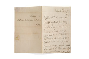 voir ces derniers temps, mais dans quelques jours je serai plus libre et j'irai vous offrir mes hommages»...L.A.S., Friday evening 24th, to the Marquise de CASTERAS; 1 page in-8, address. "Here, Madame la Marquise, are the two copies you desire. All the miseries of the world have deprived me of the honour of seeing you lately, but in a few days I shall be freer and I shall go and pay you my respects"...
