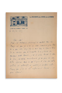 je n'ai pu vous remercier plus tôt de ce que vous avez dit de moi dans la Revue de Paris. Je ne voulais pas m'acquitter de ce plaisir en quelques mots banals, j'ai à peine besoin de vous le dire, et même maintenant je ne puis en une lettre épuiser tout ce qu'il y a à dire sur votre article si attentif, si subtil, si parfait enfin. Croyez que j'en ai été infiniment touché... et pas étonné»...L.A.S., Paris April 22, 1920, to a friend [Fernand VANDÉREM]; 1 page and a quarter in-4, header and vignette A. Monnier et Cie. La Maison des Amis des livres. "I have been so preoccupied and annoyed all these days that I could not thank you earlier for what you said about me in the Revue de Paris. I did not want to discharge this pleasure in a few banal words, I hardly need to tell you, and even now I cannot in one letter exhaust all that there is to say about your article, which is so attentive, so subtle, so perfect at last. Believe me, I was infinitely touched by it... and not surprised"...