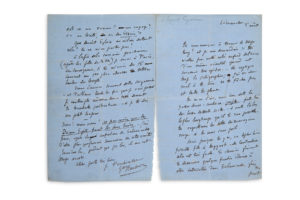 lettre, en termes crus, sur l'avancement de Salammbô. «Je commençais à trouver le temps long! et je me demandais si tu n'étais pas resté collé au fond de l'anus d'un môme oriental quand est survenue ton épître. Tu négliges trop la calligraphie; j'ai eu du mal à te lire. Ne te fâche pas, et taille tes plumes. Tu m'as l'air, mon bon, de te la passer douce. Continue, profite, fouts toi des bosses de toutes sortes. - & reste là-bas le plus longtemps qu'il te sera possible. Tu regretteras les bottes de maroquin rouge et les cons sans poil. Mais puisque tu y es, va le plus loin possible. File à Tuggurt. - de Constantine cela est très facile. Si chemin faisant tu découvres quelque facétie idoine à être intercallée dans Salammbô, fais en part à ton ami. [...] Nous ne nous verrons pas énormément, cet hiver. J'irai “dans la moderne Athènes” au mois de novembre, pour la pièce de Bouilhet. - Puis je reviendrai ici - seul - abattre le plus de pages que je pourrai. Car je voudrais bien que 1861 vît la fin de mon sacré roman. Je finis le chapitre VIII - (j'en aurai encore six!) Ma bataille du Macar est terminée, provisoirement du moins. Car je n'en suis pas satisfait. C'est à reprendre. Cela peut être mieux». Puis il évoque la chute de «la pièce de l'académicien Ponsard» [Ce qui plaît aux femmes], «tombée honteusem[ent], tombée comme on tombait autrefois - à plat - classiquement. C'est une élégance de plus. Mais comme le public l'a beaucoup sifflé, je me demande si ce n'est pas un Honneur? et je suspecte sa pièce de valoir mieux que les précédentes». Il lit l'Hétérogénie de son ami le Dr Pouchet: «cela m'éblouit! Quelle quantité de splendides bougreries il y a dans la nature. [...] Quelle espèce de bouquin rêves-tu? Est-ce un roman? un voyage? ou un traité? ou des Essais? Que devient Sylvie au milieu de tout cela? tu ne m'en parles pas! [...] Nous causons souvent de ta Seigneurie - et d'ailleurs toutes les fois que je vais pisser je contemple au-dessus de ma table de nuit ta truculente portraiture, - & je te dis un petit bonjour. Non! mon vieux! ne pas croire que les Beaux Sujets font les bons livres. J'ai peur, après la confection de Salammbô d'être plus que jamais convaincu de cette vérité. Rumine la, pendant que pour toi, il en est temps encore»... RÉFÉRENCE Correspondance (Pléiade), t. III, p. 100L.A.S. "Gve Flaubert" addressed to Ernest FEYDEAU. [Croisset] Sunday, August 5 [1860]; 2 pages in-8 on blue paper (small tear at center fold of second leaf affecting three letters Honteusem "ent"). Beautiful letter, in crude terms, on the progress of Salammbô. "I was beginning to find time long! and I wondered if you had not remained stuck at the bottom of the anus of an oriental mome when your epistle came. You neglect your penmanship too much; I found it hard to read you. Don't get angry, and trim your feathers. You seem to me, my good man, to be taking it easy. Go on, enjoy yourself, get all kinds of bumps. - Stay there as long as you can. You'll miss the red leather boots and the hairless cunts. But while you're there, get as far away as you can. Go to Tuggurt. - From Constantine it is very easy. If on the way you discover some joke suitable for inclusion in Salammbô, tell your friend about it. [...] We shall not see much of each other this winter. I shall go "to modern Athens" in November, for Bouilhet's play. - Then I'll come back here - alone - to cut out as many pages as I can. For I would like 1861 to see the end of my bloody novel. I am finishing chapter VIII - (I will have six more!) My battle of Macar is over, provisionally at least. For I am not satisfied with it. It must be taken up again. It can be better." Then he evokes the fall of "the play by the academician Ponsard" [Ce qui plaît aux femmes], "shamefully fallen, fallen as one used to fall in the past - flat - classically. It is one more elegance. But as the public hissed a lot, I wonder if it is not an Honour? and I suspect that his play is better than the previous ones". He reads the Heterogenia of his friend Dr. Pouchet: "It dazzles me! What a quantity of splendid nonsense there is in nature. [...] What kind of book are you dreaming of? Is it a novel? a journey? or a treatise? or the Essays? What becomes of Sylvie in the midst of all this? You don't tell me! [...] We often talk about your Lordship - and besides, every time I go to pee I contemplate your truculent portrait above my bedside table, - & I say a little hello to you. No! my old man! do not believe that Beautiful subjects make good books. I am afraid, after the making of Salammbô, that I am more than ever convinced of this truth. Rumine la, while for you, there is still time... REFERENCE Correspondence (Pléiade), t. III, p. 100