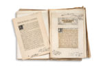 préparé par son mari Horace Finaly, tiré à 150 exemplaires numérotés hors commerce, recueillant des textes écrits entre 1910 et 1915, consacrés à des impressions de voyage, Romain Rolland, Colette, Tolstoï etc. Spécimens de mise en pages, essais au crayon et à la plume de lettrines et d'autres ornements, et épreuves corrigées, avec timbres à date de l'imprimeur (1922).Proofs, [Reliquiae, 1925]; more than 300 leaves of various sizes, in half-brown morocco folder and slipcase. 6 sets of proofs for Reliquiae (Léon Pichon, 1925), a posthumous book by Marguerite Finaly (née Pompée) prepared by her husband Horace Finaly, printed in 150 numbered copies off the market, collecting texts written between 1910 and 1915, devoted to travel impressions, Romain Rolland, Colette, Tolstoy etc. Layout specimens, pencil and pen tests of lettering and other ornaments, and corrected proofs, with printer's date stamps (1922).