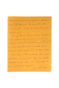 arrivez bonne première, car, dans mon isolement de tout ce qui est l'Europe, j ‘ignorais même la mort d'Albert Vandal. J'espère et souhaite beaucoup vous donner ma voix pour M de Pomairols; je vous enverrai ma parole ferme quand je saurai les noms de ses concurrents, mais je crois bien que ce sera oui. Je quitte la Turquie dans 8 jours. Très mélancoliquement je jouis de l'été qui finit, de l'Orient qui finit, de mon semblant de jeunesse qui finit, de tout ce qui s'en va sans retour»...L.A.S., Istanbul October [1910, to Julia DAUDET]; 2 pages in-8 on yellow paper with her motto Mon mal j'enchante. Response to a request for support of Charles de Pomairols' candidacy for the Académie française... "You are the first to arrive, for, in my isolation from all that is Europe, I was unaware of Albert Vandal's death. I hope and wish very much to give you my vote for M de Pomairols; I will send you my firm word when I know the names of his competitors, but I believe it will be yes. I leave Turkey in eight days. Very melancholically I am enjoying the summer that is ending, the Orient that is ending, my semblance of youth that is ending, everything that is going away without return"...