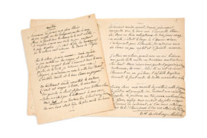 joueurs aux faces bleuies De jour souffla sur les lumignons couleur de sang, - Fleurs de pavots dans les cheveux de la nuit vieillie - Et, très pâle, à cause sans doute du jour naissant Le page Angelico - (c'était la fin des musiques) Sur le velours vert retourna la Dame de Pique»...Autograph poem signed "O.W. de Serbiny-Milosz", Angelico. 4 pages small in-4 in brown ink (pinholes at top of leaves). Youthful poem composed of 12 sizains. "The avuncular laughter of the bluish-faced players Of day blew on the blood-coloured luminaries, - Poppy flowers in the hair of the aged night - And, very pale, no doubt because of the dawning day The page Angelico - (it was the end of the musics) On the green velvet turned the Queen of Spades"...