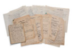 nuit doublé de nubuck gris-bleu à vitrines coulissantes de plexiglas qui laissent voir les documents. Ces trois compartiments s'assemblent de façon à former une seule boîte plein box au dos en arc-de-cercle. Le titre, mosaïqué de box ivoire sur chacune des parties, se lit dans son entier lorsqu'elles sont réunies. Ces trois compartiments sont eux-mêmes insérés dans une seconde boîte à charnières de box bleu-nuit à pois blancs. Le dos en arc-de-cercle porte le titre mosaïqué de box ivoire et s'ouvre à la façon d'une double-porte pour laisser apparaître la première boîte. Manuscrit autographe signé de 78 pages organisé en deux parties distinctes. 1ère partie: Manuscrit autographe en feuilles. 40 pages in-4: 39 pages autographes à l'encre noire et 1 p. dactylographiée et manuscrite, sur les rectos de 39 feuillets, reliés dans un demi feuillet formant chemise et portant la mention autographe «Le Verre d'eau manuscrit original 1ère partie», le tout après un feuillet de couverture de papier fort saumon portant la mention autographe «Le verre d'eau» et «Pour la Galerie Louise Leiris avec des lithos en couleur d'Eugène de Kermadec -Juin - St Léger en Yvelines 1948». Une centaine de corrections par biffures et 35 ajouts de la main de l'auteur. 2ème partie: Manuscrit autographe sur un cahier d'écolier. 38 pages in-4 sur 33 feuillets de papier quadrillé d'un cahier d'écolier à spirales. Signature autographe «F. Ponge» au feuillet numéroté «14». Une quinzaine de mots ou groupes de mots biffés et corrigés et 15 ajouts de la main de l'auteur. 3ème partie (épreuves et lettres): Tapuscrit par l'auteur avec corrections autographes. 60 pages in-4 dactylographiées reliées par agrafes métalliques précédées de 1 page in- 4 avec la mention autographe «(ici le verre d'eau)» à l'encre bleue. Le feuillet numéroté «60» est détaché; 2 pages dactylographiées entièrement biffées et non agrafées; 40 mots biffés et corrigés, 20 ajouts et 20 biffures, ainsi que nombreuses indications à l'attention du typographe de la main de l'auteur à l'encre de couleurs bleue et fuchsia. 1 page in-4 autographe «note pour la composition en placards» à l'encre de couleurs bleue et fuchsia déchiré dans la hauteur. Le tout dans un feuillet plié formant chemise portant la mention autographe à l'encre bleue «Le Verre d'eau 3e épreuve (en bon à tirer) le 25 x [décem]bre - 49». Jointes à la troisième partie: - 1 lettre dactylographiée de l'éditeur Daniel- Henri Kahnweiler à Francis Ponge, 2 pages in-4 sur papier à en-tête de la galerie Louise Leiris. Datée [Paris] 19-7-49 - 1 lettre dactylographiée de René Micha à Francis Ponge 1 page datée Bruxelles 24 juillet 1958.Le Verre d'eau, manuscript and typescript [1949]. Very ingenious triple slipcase with system signed by Renaud Vernier and dated 1984. Each of the three parts of the manuscript is placed in a midnight blue box compartment lined with grey-blue nubuck with sliding Plexiglas windows that allow the documents to be seen. These three compartments are assembled to form a single full box with an arched spine. The title, mosaicked in ivory box on each of the parts, can be read in its entirety when they are joined. These three compartments are themselves inserted in a second hinged box of night-blue box with white spots. The arched spine bears the mosaic title in ivory box and opens like a double door to reveal the first box. Signed autograph manuscript of 78 pages organized in two distinct parts. 1st part: Autograph manuscript in sheets. 40 pages in-4: 39 pages autographed in black ink and 1 p. typed and handwritten, on the fronts of 39 leaves, bound in a half sheet forming a folder and bearing the autograph mention "Le Verre d'eau original manuscript 1st part", the whole after a sheet of strong salmon paper cover bearing the autograph mention "Le verre d'eau" and "Pour la Galerie Louise Leiris avec des lithos en couleur d'Eugène de Kermadec -Juin - St Léger en Yvelines 1948". About a hundred corrections by strikethroughs and 35 additions by the author's hand. 2nd part: Autograph manuscript on a schoolboy notebook. 38 pages in-4 on 33 sheets of squared paper of a spiral-bound schoolbook. Autograph signature "F. Ponge" on the sheet numbered "14". About fifteen words or groups of words crossed out and corrected and 15 additions in the author's hand. 3rd part (proofs and letters): Typescript by the author with autograph corrections. 60 in-4 typewritten pages bound with metal staples preceded by 1 in-4 page with the autograph notation "(here the glass of water)" in blue ink. Sheet numbered "60" is detached; 2 typewritten pages entirely crossed out and not stapled; 40 words crossed out and corrected, 20 additions and 20 deletions, as well as numerous indications to the typographer in the author's hand in blue and fuchsia ink. 1 page in-4 autograph "note for the composition in placards" in blue and fuchsia ink torn in height. The whole in a folded sheet forming a folder bearing the autograph note in blue ink "Le Verre d'eau 3e épreuve (en bon à tirer) le 25 x [décem]bre - 49". Attached to the third part: - 1 typed letter from the publisher Daniel- Henri Kahnweiler to Francis Ponge, 2 pages in-4 on letterhead of the Louise Leiris gallery. Dated [Paris] 19-7-49 - 1 typed letter from René Micha to Francis Ponge 1 page dated Brussels 24 July 1958.