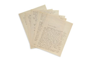 quelques ratures et corrections. L'écriture est difficile à déchiffrer, et les citations que nous donnerons sont parfois conjecturales. «J'avais atterri au Maroc à l'occasion d'une piste. Et j'avais logé à Foued el Hassan et Goulimine, ces postes présahariens déjà oasis avec leurs palmeraies, leurs eaux courantes et ces laveuses de linge qui font le miracle des oasis. Tout à coup le domaine des hommes cesse dans la terre blanche et le sable». Il évoque les «routes escarpées de l'Atlas, [...] ces crevasses dans la falaise où commence la mer. Et déjà ces récifs où l'eau devient divinité. «Il est parti avec son outre d'eau. Il pensait atteindre le poste... Mais le puis sur lequel il comptait était tari. Il s'est arrêté à quelque 2 kilomètres, on l'a retrouvé qui s'en revenait...» Déjà cette atmosphère se différencie de la Beauce. Le Bohémien y peut, les yeux fermés, se mouvoir et vivre. Il habite ce grand parc de l'Europe»... Pourquoi l'homme ne veut-il pas quitter les villes? «Celui qui vécut la nuit dans le désert, auprès d'un feu transi, et qui voit lentement paraître vers l'est les étoiles... Je n'avais qu'à franchir mon souvenir pour la retrouver [...] Ce vent, ce sable, ces étoiles, et ce soleil. Et installé là pour les conserver, l'homme. [...] Marchant de poste en poste on le retrouve qui vous tape sur l'épaule et qui vous désaltère, [...] dans ces oasis parmi les palmiers et les putains [...] ou s'il chemine en caravane portant ses pacotilles peut-être d'un bled à l'autre mais aussi ses amours [...] et ses regrets et ses désirs»... Saint-Ex retrouve celui qui «a été notre interprète sur la ligne, pendant des années, vers Beyrouth. Il est caïd de quelque part»... Puis il évoque le capitaine de Latour, qui raconte un épisode de la guerre du Rif [ce passage a été repris, avec des variantes et sans le nom de l'officier, dans l'article de Paris-Soir du 4 octobre 1938, «Il faut donner un sens à la vie des hommes», partie du reportage La Paix ou la Guerre?, et intégré au chap. VIII de Terre des hommes (Pléiade, t. I, p. 277-278 et 356-357)]: le capitaine reçoit des parlementaires d'une tribu de la montagne, quand son poste est attaqué par une autre tribu; ses hôtes l'aident à repousser l'attaque. «Le lendemain c'est à eux d'attaquer Latour. Mais avant la bataille un émissaire vient le trouver. /- Hier nous t'avons défendu. Nous avons dépensé pour toi trente cartouches. Rends les nous. /- C'est régulier... /Latour les rend, en grand seigneur, ces balles qui lui sont destinées. [...] Il m'a raconté cette histoire. Et il se tait et je me tais. Et je sais bien ce qu'il regrette. Cette noblesse dans les rapports humains. [...] Je pouvais bien lui demander «justifiez la moi, votre guerre?» Il me répondrait de travers parce que l'on a des concepts. Et qu'il faut bien, tant bien que mal, se justifier. Mais au fond il n'y croira pas, ni personne. Ça c'est ma grande vérité sur la guerre»... Etc.Autograph manuscript. [1938?]; 6 pages in-4 in black ink. Unpublished text, evocation of the oases, and reflection on the war, a passage of which will be reused in Terre des hommes. The manuscript presents some erasures and corrections. The writing is difficult to decipher, and the quotations we will give are sometimes conjectural. "I had landed in Morocco on the occasion of a trail. And I had stayed in Foued el Hassan and Goulimine, these pre-Saharan posts already oases with their palm groves, their running water and these washing machines which make the miracle of the oases. Suddenly the domain of men ceases in the white earth and the sand". He evokes the "steep roads of the Atlas, [...] those crevices in the cliffs where the sea begins. And already these reefs where the water becomes divine. "He left with his water bag. He thought he would reach the post... but the well he was counting on had dried up. He stopped about 2 kilometers away, and we found him coming back..." This atmosphere is already different from the Beauce. The Bohemian can, with his eyes closed, move and live. He lives in this great park of Europe"... Why does man not want to leave the cities? "He who lived by night in the desert, by a warm fire, and saw the stars slowly appearing towards the east... I had only to cross my memory to find her [...] This wind, this sand, these stars, and this sun. And installed there to preserve them, the man. [...] Walking from post to post, we find him tapping you on the shoulder and quenching your thirst, [...] in these oases among the palm trees and the whores [...] or if he travels in a caravan, perhaps carrying his junk from one village to another, but also his loves [...] and his regrets and his desires... Saint-Exupéry finds the man who "was our interpreter on the line, for years, towards Beirut. He is a kaid from somewhere"... Then he mentions Captain de Latour, who recounts an episode of the Rif war [this passage was taken up, with variations and without the name of the officer, in the article in Paris-Soir of October 4, 1938, "Il faut donner un sens à la vie des hommes" (We must give a meaning to men's lives), part of the report La Paix ou la Guerre? and integrated in chap. VIII of Terre des hommes (Pléiade, t. I, p. 277-278 and 356-357)]: the captain receives parliamentarians from a mountain tribe, when his post is attacked by another tribe; his hosts help him to repel the attack. "The next day it is their turn to attack Latour. But before the battle an emissary comes to him. /- Yesterday we defended you. We spent thirty rounds of ammunition on you. Give them back to us. /That's regular... /Latour gives them back, like a great lord, these bullets that are intended for him. [...] He told me this story. And he is silent and I am silent. And I know what he regrets. That nobility in human relations. [...] I could well ask him "justify your war to me?" He would answer me wrongly, because we have concepts. And
