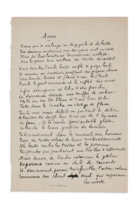 Plume n°279 du 1er décembre 1900. [...] «Anne qui se mélange au drap pâle et délaisse /des cheveux endormis sur ses yeux mal ouverts /mire ses bras lointains tournés avec mollesse /sur la peau sans couleur du ventre découvert» Anne fut publié dans des versions chaque fois différente: en 1912 dans la revue Le Recueil pour Ariane (5 strophes), en 1920 dans la revue Les Ecrits nouveaux, en 1920 dans Album de vers anciens (9 strophes) et en 1926 dans la nouvelle édition d'Album de vers anciens (13 strophes). Pléiade tome I pp. 89-91, 1567-1569"Anne" autograph poem. Autograph poem, 6 quatrains of alexandrines on one page in-8. First version of this youthful poem written in 1893 published in Album de vers anciens in 1920 as it appeared in La Plume magazine #279 of December 1, 1900. [...] "Anne qui se mélange au drap pâle et délaisse /des cheveux endormis sur ses yeux mal ouverts /mire ses bras lointains tournés avec mollesse /sur la peau sans couleur du ventre découvert" Anne was published in different versions each time: in 1912 in the review Le Recueil pour Ariane (5 stanzas), in 1920 in the review Les Ecrits nouveaux, in 1920 in Album de vers anciens (9 stanzas) and in 1926 in the new edition of Album de vers anciens (13 stanzas) Pléiade tome I pp. 89-91, 1567-1569