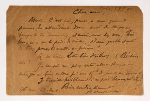 VERLAINE s'adresse à son ami Gabriel VICAIRE, lui-même juriste, écrivain et poète. «C'est ça, pense à moi quand tu pourras. En attendant donne-moi de temps en temps de tes nouvelles et envoie-moi des vers... Je ne compte plus rester éternellement ici [Verlaine évoque vraisemblablement son séjour à l'hôpital Saint-Joseph, rue Didot d'où est envoyée la carte postale] mais j'en ai bien encore pour une 15e de jours au bas mot. Je travaille terriblement: au petit bravo, m'sieur [...]».Autograph card signed "P.Verlaine" addressed to Gabriel Vicaire. Paris, 5 September 1892. Brown ink, in-12 oblong. (Smudging, slight lacks at the upper corners without affectation). Two poets correspond. VERLAINE addresses his friend Gabriel VICAIRE, himself a lawyer, writer and poet. "That's it, think of me when you can. In the meantime, give me news from time to time and send me verses... I don't intend to stay here forever [Verlaine is probably referring to his stay at the Saint-Joseph hospital, rue Didot, from which the postcard is sent] but I'll be here for at least another 15 days. I'm working terribly: cheers, sir [...]".