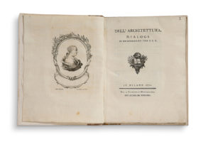 [ARCHITECTURE]. PINI Ermenegildo (1739-1825) Dell'Architectura. Dialogi di Ermenigildo Pini C.R.B Milano, Marelliana, 1770. In-4 (285 x 215 mm), en italien, frontispice -titre-[4]-88 pp.-5 pl. dépliantes. Demi-cartonnage à dos de papier marbré....