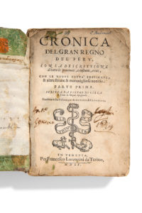 177 à 192), en italien. Couverture de papier dominoté vert et orange. Marque typographique au titre, bandeaux et lettrines gravées sur bois et illustrées. Nombreuses annotations manuscrites marginales anciennes, en italien, tout au long du texte. Parmi les premiers explorateurs d'Amérique du Sud, Pedro Cieza de Leon arrive au Pérou vers 1550. Il est nommé cette même année «Crònista de Indias» pour le compte de la couronne espagnole. RARE malgré son caractère incomplet. RÉFÉRENCE Brunet, II, 67: «Ouvrage rare; il devait avoir quatre livres, mais le premier seul a paru». PROVENANCE «C. Balmont. 1907»; tampon d'une librairie de Palma de Mallorca et mention manuscrite à l'encre datée de 1907; signature manuscrite biffée à l'encre au titre avec mention «Genova. 1613» (Reliure très accidentée, premiers cahiers détachés; 1 page de table est en partie déchirée, quelques trous de vers portant trace de restaurations anciennes, mouillure sur quelques feuillets, rousseurs, brunissements).Cronica del gran regno del Peru', con la descrittione di tutte le provincie, e costumi e riti, [...] Venetia, Per Francesco Lorenzini da Turino, 1560. In-12 (150 x 107 mm), [12]-[219] ff. ch. (incomplete with leaves 177 to 192), in Italian. Covered in green and orange dominoté paper. Typographical mark on title, woodcut and illustrated bands and initials. Numerous early handwritten marginal annotations, in Italian, throughout the text. Among the first explorers of South America, Pedro Cieza de Leon arrived in Peru around 1550. He was appointed that same year "Crònista de Indias" on behalf of the Spanish crown. RARE in spite of its incompleteness. REFERENCE Brunet, II, 67: "Rare work; it was supposed to have four books, but only the first one was published". PROVENANCE "C. Balmont. 1907"; stamp of a bookshop in Palma de Mallorca and handwritten mention in ink dated 1907; handwritten signature crossed out in ink on the title with mention "Genova. 1613" (Binding very damaged, first quires detached; 1 page of table partly torn, some wormholes with traces of old restorations, wetness on some leaves, brownings).