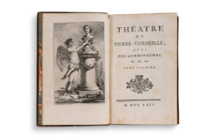 pièces de titre de maroquin brun, pièces de tomaison de maroquin havane, tranches dorées, gardes de papier marbré, signets conservés (reliures d'époque). Édition commentée par Voltaire, qui la fit imprimer par souscription chez les frères Cramer à Genève. Illustrée d'un frontispice gravé par Watelet en 1762 d'après Pierre, et de 34 figures hors-texte d'après Gravelot, gravées par Baquoy, Flipart, Lemire, Longueil, Prévost, etc. Le 1er tome contient le portrait de l'auteur gravé par Ficquet d'après Le Brun, ainsi qu'un long commentaire manuscrit du début XIXe siècle sur Racine «ardent ami de la liberté». PROVENANCE Initiale «B» d'époque à l'encre brune sur les premiers feuillets liminaires de chaque volume; «M. arnaud» à l'encre brune sur feuillet liminaire du premier tome. (État d'usage des reliures (coiffes abîmées, mors fendus, épidermures, légers manques); bon état intérieur général malgré des pages brunies, rousseurs éparses, léger manque de papier au f. de titre du tome XII au coin inférieur).The theatre of Pierre Corneille, with commentaries, &c. &c. &c. S.l. [Geneva], s.éd. [Cramer], 1764. 12 volumes in-8 (200 x 127 mm). Full blond speckled calf, triple gilt fillet in frame, smooth and ornate spines, brown morocco title-pieces, tan morocco end-pieces, gilt edges, marbled paper end-pieces, bookmarks preserved (period bindings). Edition commented by Voltaire, who had it printed by subscription by the Cramer brothers in Geneva. Illustrated with a frontispiece engraved by Watelet in 1762 after Pierre, and 34 hors-texte figures after Gravelot, engraved by Baquoy, Flipart, Lemire, Longueil, Prévost, etc. The first volume contains the portrait of the author engraved by Ficquet after Le Brun, as well as a long handwritten commentary from the beginning of the 19th century on Racine, "ardent friend of liberty. PROVENANCE Period initial "B" in brown ink on the first flyleaves of each volume; "M. arnaud" in brown ink on the flyleaf of the first volume. (Bindings in used condition (headbands damaged, spine split, epidermis, slight loss); general good interior condition despite browned pages, scattered freckles, slight paper loss on the title page of volume XII at the lower corner).