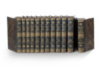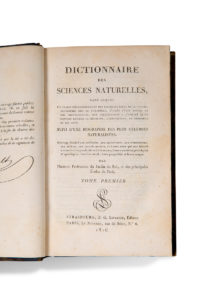 d'après l'état actuel de nos connoissances, soit relativement à l'utilité qu'en peuvent retirer la médecine, l'agriculture, le commerce et les arts. [...] Strasbourg, F. G. Levrault, Paris, Le Normant, 1816-1830. 71 volumes in-8 (215 x 135 mm), 60 de texte et 11 de planches. Demi-basane bleu nuit, roulette à froid en encadrement des plats, dos lisse titré, tomé et orné de caissons, fers et filets dorés, tranches marbrées (reliure d'époque). Seconde édition des cinq premiers volumes et édition originale des suivants. Ouvrage publié sous la direction de Frédéric Cuvier, à l'initiative de la librairie Levrault de Strasbourg. Il contient des contributions par Jussieu, Lamarck, Dumont de Sainte-Croix, Laurent, Brongniart, etc. Important ouvrage illustré de 1218 (sur 1220) planches en noir et pour la plupart soigneusement coloriées à l'époque, gravées sous la direction du naturaliste Pierre-Jean-François Turpin, figurant des mammifères, rongeurs, carnassiers, cétacés, végétaux, oiseaux, minéraux, crustacés, etc. Turpin fait appel au peintre Prêtre, et à de nombreux graveurs tels que Massard, Legrand et Coutant. Les volumes de texte contiennent des tableaux dépliants et quelques hors-texte. À noter que le volume de tables (le 72ème) que contiennent beaucoup d'exemplaires de cette édition est ici incorporé au début de chaque volume de planches. (Rousseurs; état d'usage des reliures, coins émoussés).Dictionnaire des sciences naturelles, dans lequel on traite méthodiquement des différens êtres de la nature, considérés soit en eux-mêmes, d'après l'état actuel de nos connoissances, soit relativement à l'utilité qu'en peuvent retirer la médecine, l'agriculture, le commerce et les arts. [...] Strasbourg, F. G. Levrault, Paris, Le Normant, 1816-1830. 71 volumes in-8 (215 x 135 mm), 60 of text and 11 of plates. Half dark blue basane, cold-stamped roulette framing the boards, smooth titled spine, tomé and decorated with gilt boxes, irons and fillets, marbled edges (period binding). Second edition of the first five volumes and first edition of the following ones. Work published under the direction of Frédéric Cuvier, on the initiative of the Levrault bookshop of Strasbourg. It contains contributions by Jussieu, Lamarck, Dumont de Sainte-Croix, Laurent, Brongniart, etc. Important work illustrated with 1218 (out of 1220) plates in black and for the most part carefully coloured at the time, engraved under the direction of the naturalist Pierre-Jean-François Turpin, depicting mammals, rodents, carnivores, cetaceans, plants, birds, minerals, crustaceans, etc. Turpin calls upon the painter Prêtre, and numerous engravers such as Massard, Legrand and Coutant. The text volumes contain folding tables and some hors-texte. Note that the volume of tables (the 72nd) that many copies of this edition contain is here incorporated at the beginning of each volume of plates. (Freckles; condition of bindings, corners dulled)
