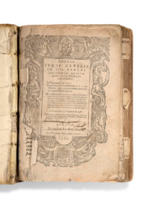*[8]-**[4]-S[8]; (IV) B[8], en latin. Plein vélin souple, plats ornés d'une frise décorative et d'un double encadrement de filets à froid, médaillon central à froid, dos lisse orné de quatre bandeaux de frises décoratives, rabats (reliure de l'époque). Première édition du Code justinien commentée par le juriste Denys Godefroy. Elle est illustrée d'une planche en double-page représentant le schéma des lignes de parenté et ornée sur le titre de la marque de l'éditeur genevois, à la devise «Sine te nihil». Exemplaire annoté en latin par un lecteur contemporain de l'édition, comportant un ex-libris manuscrit de l'époque sur le feuillet de titre. (Reliure déreliée, dos accidentée (mouillure), manque à l'angle du rabat supérieur). PROVENANCE Ferdinand Courbon (mention manuscrite sur contregarde). RÉFÉRENCE Baudrier, IV, 153 (réémission à l'adresse de Barthélémy Honorat).Corpus juris civili in IIII partes distinctum Lyon [Geneva], Barthélémy Vincent, 1583. 3 volumes in one in-4 volume (257 x 180 mm), (I) q[8]-qq[8]-s[8]-Z[8]-ZZ[8]-ZZZ[8]-AAAA[8]; (II) †[8]-††2-z[8]-gg[8]-[1]; (III) *[8]-**[4]-S[8]; (IV) B[8], in Latin. Soft vellum, boards decorated with a decorative frieze and a double frame of cold fillets, central medallion in cold, smooth spine decorated with four decorative frieze bands, flaps (contemporary binding). First edition of the Justinian Code commented by the jurist Denys Godefroy. It is illustrated with a double-page plate representing the scheme of kinship lines and decorated on the title with the Geneva publisher's mark, with the motto "Sine te nihil". A copy annotated in Latin by a contemporary reader of the edition, with a handwritten ex-libris of the time on the title leaf. (Binding unbound, spine damaged (spotting), corner of the upper flap missing). PROVENANCE Ferdinand Courbon (handwritten mention on the back cover). REFERENCE Baudrier, IV, 153 (re-issue at the address of Barthélémy Honorat).