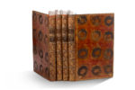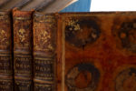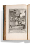 d'angle encadrant 12 cercles à froid, dos à nerfs orné de fers et fleurons dorés, pièces de titre et de tomaison de maroquin brun, double filet doré sur les coupes, roulette intérieure dorée, tranches dorées, gardes de papier bleu (reliure d'époque). Un des exemplaires sur papier de Hollande de ce grand classique de la bibliophilie au XVIIIe siècle, en second tirage (la planche CLXXII illustrant Le Singe et le Léopard, tome III, p.111, comprend la légende sur la banderole). Cette magnifique édition est illustrée d'un portrait-frontispice terminé au burin par Dupuis et gravé par Cochin (le portrait d'Oudry gravé par Tardieu d'après Largillière manque comme souvent), et de 275 planches hors-texte gravées par Chedel, Cochin, Aubert, Aveline, Baquoy, etc. d'après les dessins de Jean-Baptiste Oudry. COLLATION Tome I: [1] f. (faux-titre)-[1] ff. (frontispice gravé)-[1] f. (titre)-xxx (dédicace, avertissement, vie de La Fontaine)-xviii (dédicace, préface, la vie d'Esope, Table des fables)-124 pp., plus 70 planches. Tome II: [2] ff. (faux-titre et titre)-ii (table des fables)-135 pp., plus 68 planches. Tome III: [2] ff. (faux-titre et titre)- iv (avertissement, table des fables) -146 pp., plus 68 planches. Tome IV: [2] ff. (faux-titre et titre)-ij (table des fables)-188 pp., plus 69 planches. MAGNIFIQUE RELIURE D'ÉPOQUE. RÉFÉRENCE Cohen, 548-550. (Tome I: Restauration ancienne p. 29, légère déchirure à l'angle inférieure p.75; Tome III: trace de stylo sur contregarde; légère déchirure à l'angle inférieure pl.CXXXVIII; tome IV: restauration marginale ancienne pl. CCXXVI).Fables choisies, mises en vers Paris, Desaint & Saillant, Durand, 1755-1759. 4 volumes in-folio (423 x 285 mm). Full porphyry calf, triple gilt fillet on covers with corner fleurons framing 12 cold circles, spine ribbed and decorated with gilt irons and fleurons, brown morocco title and greef, double gilt fillet on edges, gilt inner border, gilt edges, blue paper endpapers (period binding). One of the copies on Hollande paper of this great classic of 18th century bibliophily, in its second printing (plate CLXXII illustrating Le Singe et le Léopard, volume III, p.111, includes the legend on the banner). This magnificent edition is illustrated with a portrait-frontispiece finished in burin by Dupuis and engraved by Cochin (the portrait of Oudry engraved by Tardieu after Largillière is missing, as is often the case), and 275 hors-texte plates engraved by Chedel, Cochin, Aubert, Aveline, Baquoy, etc. after drawings by Jean-Baptiste Oudry. COLLATION Volume I: [1] f. (faux-title)-[1] ff. (engraved frontispiece)-[1] f. (title)-xxx (dedication, warning, life of La Fontaine)-xviii (dedication, preface, life of Aesop, table of fables)-124 pp. plus 70 plates. Volume II: [2] ff. (false title and title)-ii (table of fables)-135 pp. plus 68 plates. Volume III: [2] ff. (false title and title)- iv (warning, table of fables) -146 pp. plus 68 plates. Volume IV: [2] ff. (false-title and title)-ij (table of fables)-188 pp. plus 69 plates. MAGNIFICENT EPOQUE BINDING. REFERENCE Cohen, 548-550. (Volume I: old restoration on p. 29, slight tear at lower corner on p.75; Volume III: trace of pen on flyleaf; slight tear at lower corner on pl.CXXXVIII; volume IV: old marginal restoration on pl. CCXXVI).