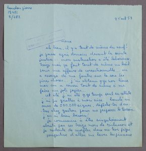 témoigne que, du fond de sa prison, sans se plaindre des conditions, le futur Alphonse Boudard consacre l'essentiel de son énergie à l'écriture. Il annonce qu'après 13 mois d'instruction, il passera au tribunal le lendemain, […] " on a essayé de me mettre sur la soie les pires choses… j'ai obtenu q.qs non-lieux mais on a réussi tout de même à me faire un joli papier… ". Malgré la détention, il prolonge son travail d'écriture : " Cet été j'ai été q.qs temps seul en cellule j'ai pu gratter à mon aise… bouclé un ours de 800.000 signes, dépêche-toi d'entrer chez Gaston [Gallimard ?] pour me préparer le terrain, j'en ai bien besoin ! ". Il se montre soucieux à la perspective d'une réclusion étendue, et ajoute : " c'est la dernière fois que j'ai le droit de t'écrire, une fois condamné, la correspondance est limitée à la famille (le travail et la patrie, peut-être, mais je n'en suis pas sûr). ". Il remercie d'un colis reçu, ajoute qu'il n'a besoin de rien, " j'ai des livres et de quoi écrire, c'est l'essentiel […] tu vois que mon redressement moral est en cours… en sortant, j'irai vendre la bible avec les nanas de l'armée du salut. "