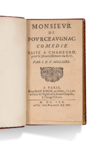 daté, double filet doré sur les coupes, large dentelle intérieure, tranches dorées (reliure signée Gruel). Édition originale de cette comédie-ballet, représentée pour la première fois le 6 octobre 1669 au Château de Chambord, devant Louis XIV. Cette pièce fut ensuite présentée au public du Théâtre du Palais-Royal le 15 novembre de la même année par la Troupe du Roy. Elle connut un grand succès. Cette oeuvre de Molière est «extrêmement rare» (Le Petit), «une des plus rares comédies de Molière» selon Guibert. Très bel exemplaire. RÉFÉRENCES Guibert, I, 297 - Le Petit, p. 303. (Légère piqure sur le f. de privilège sans affectation). Monsieur de Pourceaugnac, comedy. Made in Chambord for the King's entertainment. Paris, Jean Ribou, 1670. In-12 (150 x 90 mm), [6]-136 pp. Cherry red jansenist morocco, spine titled and dated, double gilt fillet on the edges, large inner lace, gilt edges (binding signed Gruel). First edition of this comedy-ballet, performed for the first time on October 6, 1669 at the Château de Chambord, in front of Louis XIV. This play was then presented to the public at the Théâtre du Palais-Royal on November 15 of the same year by the Troupe du Roy. It was a great success. This work by Molière is "extremely rare" (Le Petit), "one of the rarest of Molière's comedies" according to Guibert. A very fine copy. REFERENCES Guibert, I, 297 - Le Petit, p. 303. (Slight stain on the privilege f. without affectation)