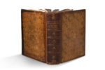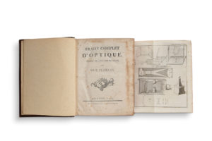 moucheté blond sur ais de bois avec chiffre couronné du roi de Prusse Frédéric II, dos à nerfs orné et titré doré, pièce de titre de maroquin bordeaux, tranches rouges (reliure d'époque). Exemplaire au chiffre couronné du roi de Prusse Frédéric II (1740- 1786). Première traduction française par le père Esprit Pézenas parue simultanément avec celle de Duval-Le-Roy chez Malassis à Brest et chez Durand à Paris. Traduit de l'anglais d'après l'originale de Robert Smith parue à Cambridge en 1738, sous le titre de: A Compleat System of Opticks in Four Books. Cette traduction est la plus recherchée car elle comprend les «Additions sur une difficulté concernant le mouvement rectiligne de la lumière». Pézenas y rapporte diverses expériences qu'il a faites sur la lumière et la vision. Cet ouvrage fut celui qui eut le plus d'influence sur l'optique au XVIIIe siècle. En 3 parties, ce traité est illustré de 67 planches dépliantes gravées hors-texte (complet). PROVENANCE Bibliothèque royale des rois de Prusse (monogramme sur le plat supérieur et cachet rouge: «Ex Biblioth. Regia Berolinensi.»). Assez bon état général (épidermures et frottements, coins émoussés; rousseurs éparses, f. de titre monté sur onglets).[OPTICS]. [SMITH Robert] - PEZENAS Esprit (1692-1776) Traité complet d'optique. Translated from the English by Smith Avignon, Aux dépens de la Compagnie, 1767. Fort in-4 (265 x 210 mm), title f. -739-[3] pp. Brown basane, boards added in blond speckled calf on wooden boards with crowned figure of the king of Prussia Frederic II, spine ribbed and titled in gilt, title page in maroon morocco, red edges (period binding). Copy with the crowned cipher of the Prussian King Frederick II (1740- 1786). First French translation by Father Esprit Pézenas published simultaneously with that of Duval-Le-Roy by Malassis in Brest and Durand in Paris. Translated from English after the original by Robert Smith published in Cambridge in 1738, under the title of: A Compleat System of Opticks in Four Books. This translation is the most sought after because it includes the "Additions sur une difficulté concernant le mouvement rectiligne de la lumière". Pézenas reports various experiments he made on light and vision. This work was the one that had the most influence on optics in the 18th century. In 3 parts, this treatise is illustrated with 67 folding plates engraved out of text (complete). PROVENANCE Royal Library of the Kings of Prussia (monogram on the upper cover and red stamp: "Ex Biblioth. Regia Berolinensi."). Fairly good condition (spotting and rubbing, corners dulled; scattered foxing, title f. mounted on tabs).
