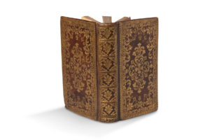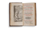 filets, fines roulettes, dentelle et fleurons dorés ornant les plats, dos lisse orné, roulette sur les coupes, tranches dorées (reliure italienne d'époque). Frontispice gravé et légendé dans la lettre. Titre en rouge et noir. Charmante reliure italienne à grand décor du XVIIIe siècle. (Rousseurs éparses; coins émoussés, légers trous de vers sur dos, mors légèrement frottés).[BINDING] Introduzione alla vita devota composta da S. Francesco di Sales vescovo di Genova Padua, Stamperia de Seminario Appresso Giovanni Manfrè, 1761. In-12 (146 x 85 mm), 407 pp. in Italian. Red morocco with large decoration, framed with fillets, fine roulettes, lace and gilt fleurons adorning the boards, smooth ornamented spine, roulette on the edges, gilt edges (Italian period binding). Frontispiece engraved and captioned in the letter. Title in red and black. Charming 18th century Italian binding with large decoration. (Scattered brown spots; corners dull, slight wormholes on spine, spine ends slightly rubbed).