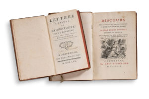 dorés, pièces de titre de maroquin blond, tranches rouges, signet conservé (reliure d'époque). Rare véritable édition originale avec le frontispice signé D. Sornique d'après Eisen (placé ici à la suite du titre), la vignette de titre signée S. Fokke et le bandeau armorié monogrammé par S. Fokke (d'après Soubeyran selon Dufour). La dédicace est signée «Jean Jaques Rousseau» et l'accentuation du mot «conforme» corrigée à la main par l'éditeur (p. 11, l. 16) et les 3 cartons signalés dans l'avis au relieur au verso du feuillet d'errata. Réf. Dufour I:55. - Tchemerzine-Scheler V:532. - Conlon 55:1030. - Cohen 903. Bon exemplaire malgré sa reliure usagée avec manque au coin supérieur, rares piqures. L'on joint: Lettres écrites de la montagne. Amsterdam, Marc Michel Rey, 1765. 2 parties en 1 volume in-12 (170 x 104 mm), iv-234-[2]-[4]-156 pp. Plein veau moucheté, dos lisse orné de fers dorés, pièces de titre de maroquin blond, tranches rouges, signet conservé (reliure d'époque). PROVENANCE Cahout (ex-libris imprimés contrecollés)Discours sur l'origine et les fondemens de l'inégalité parmi les hommes [...] Amsterdam, Marc Michel Rey, 1755 In-8 (197 x 130 mm), title-front, lxx-[2]-262-[2] pp. full calf spotted, smooth spine decorated with gilt irons, blond morocco title-pieces, red edges, bookmark preserved (period binding). Rare true first edition with the frontispiece signed D. Sornique after Eisen (placed here after the title), the title vignette signed by S. Fokke and the armorial headband monogrammed by S. Fokke (after Soubeyran according to Dufour). The dedication is signed "Jean Jaques Rousseau" and the accentuation of the word "conforme" corrected by hand by the publisher (p. 11, l. 16) and the 3 cartons indicated in the notice to the binder on the verso of the errata leaf. Ref. Dufour I:55. - Tchemerzine-Scheler V:532. - Conlon 55:1030. - Cohen 903. A good copy despite its worn binding with missing upper corner, rare spotting. Attached: Lettres écrites de la montagne. Amsterdam, Marc Michel Rey, 1765. 2 parts in 1 volume in-12 (170 x 104 mm), iv-234-[2]-[4]-156 pp. Full speckled calf, smooth spine decorated with gilt irons, blond morocco title-pieces, red edges, bookmark preserved (period binding). PROVENANCE Cahout (printed bookplates pasted on)