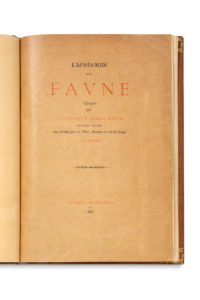 MALLARMÉ Stéphane (1842-1898)L'Après-midi d'un Faune. Eglogue par Stéphane Mallarmé. Nouvelle édition avec frontispice, ex-libris, fleurons et cul-de-lampe par Manet Paris, Léon Vanier, 1887. In-8 (233 x 160 mm), 16 pp. Plein maroquin ocre,...