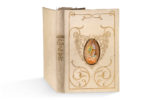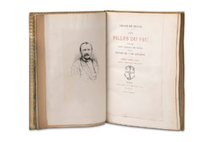 servant de cadre au médaillon central représentant une jeune femme chapeautée, mis en couleurs à l'aquarelle, dos lisse titré à la feuille d'or, tête dorée, roulette dorée intérieure, doublures et gardes de papier marbré, couverture conservée, signet conservé (reliure postérieure mais d'époque). Exemplaire non rogné du tirage de tête en grand papier en 175 exemplaires, celui-ci l'un des 10 sur papier du Japon (n°4) avec les eaux-fortes de Le Rat d'après les dessins d'Adan en triple épreuve, dont une sur papier Whatman. Superbe exemplaire de cette édition illustrée d'un chef-d'oeuvre de la littérature française, magnifié par une reliure unique. Rare. (Très bon état malgré légères traces d'encres en bas de certains feuillets; quelques frottements à la reliure) RÉFÉRENCE Vicaire, I, 586The Daughters of the Fire. Sylvie. Jemmy-Octavie-Isis-Émilie Paris, Librairie des bibliophiles, 1888. In-8 (241 x 170 mm), 250 pp. Board decorated on the upper board with a gold leaf decoration serving as a frame for the central medallion representing a young woman wearing a hat, coloured with watercolours, smooth spine titled with gold leaf, gilt head, gilt border inside, marbled paper lining and endpapers, cover preserved, bookmark preserved (later but period binding). Untrimmed copy of the first large paper edition of 175 copies, this one of the 10 on Japan paper (n°4) with the etchings by Le Rat after Adan's drawings in triple proof, one of which on Whatman paper. Superb copy of this illustrated edition of a masterpiece of French literature, magnified by a unique binding. Rare. (Very good condition despite slight traces of ink at the bottom of some leaves; some rubbing to the binding) REFERENCE Vicaire, I, 586