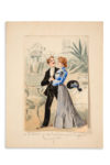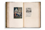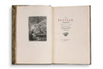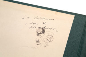 illustré de 20 héliogravures en noir et en couleurs très libres, sous passe-partout, de Marcel Vertès. Envoi autographe avec dessin original à la plume: «à M. Valotaire «don V. fils de Zorro» (sur contreplat de la chemise). (Rabats de la chemise partiellement déchirés, dos partiellement détaché). - DUPLESSIS BERTHAULT - [VOLTAIRE], La Pucelle d'Orléans. Poème en vingt-un chants. Londres, s. éd., 1780, tome II uniquement. Grand in-8 (253 x 170 mm), 175 pp. Plein maroquin bordeaux, plats ornés d'un double triple filet doré en encadrement avec des fleurons aux angles de l'encadrement central, do à nerfs, titré, tomé, daté, et orné, tête dorée, large dentelle intérieure dorée (reliure signée Lanscelin). Édition illustrée de figures gravées en couleurs par Duplessis Berthault. Très bel exemplaire à grandes marges. PROVENANCE: «Juin 40. Le Luet», ex-libris contrecollé. (Accident à la coiffe supérieure). - Ensemble de 23 vignettes XVIIIe siècle contrecollées et numérotées à l'encre sur 22 feuillets numérotés, d'une quinzaine de dessins aquarellés fin XIXe certains légendés au crayon, et de divers gravures et dessins aquarellés XVIIIe-XIXe dont certaines japonaises rehaussées en couleurs. Le tout est conservé dans un portfolio grand in-4.[CURIOSA] - VERTÈS Marcel (1895-1961), Entrée interdite au public. S. l., s. ed., [1926]. In-4 (325 x 242 mm), in sheets, in a titled publisher's folder. Unique edition of 250 numbered copies on Japon impérial (this one n°25), illustrated with 20 heliogravures in black and in very free colours, under matting, by Marcel Vertès. Autograph address with original pen drawing: "to M. Valotaire "don V. fils de Zorro" (on the back cover of the folder) (Flaps of the folder partly torn, spine partly detached). - DUPLESSIS BERTHAULT - [VOLTAIRE], La Pucelle d'Orléans. Poem in twenty-one songs. London, s. éd., 1780, volume II only. Large in-8 (253 x 170 mm), 175 pp. Full burgundy morocco, boards decorated with a double triple gilt fillet with fleurons at the corners of the central frame, ribbed, titled, tomé, dated, and decorated, gilt head, large gilt inner lace (binding signed Lanscelin). Edition illustrated with colour engraved figures by Duplessis Berthault. A very fine copy with large margins. PROVENANCE: "Juin 40. Le Luet", bookplate pasted on. (Damage to the upper cover). - Set of 23 18th century vignettes pasted and numbered in ink on 22 numbered leaves, about fifteen late 19th century watercolour drawings, some of them captioned in pencil, and various 18th-19th century engravings and watercolour drawings, some of them Japanese enhanced in colour. The whole is preserved in a large in-4 portfolio.