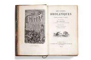 or, tête dorée, signet conservé. Cinquième édition illustrée de 425 dessins par Gustave Doré. Complet de sa Table des dessins, et de l'Avertissement du libraire. Bel exemplaire (malgré rousseurs éparses).Les contes drolatiques Paris, Société générale de librairie, 1855. Fort in-8 (210 x 140 mm), 614 pp. Havana half-maroquin with corners, double cold fillet in frame, spine titled in gold, gilt head, bookmark preserved. Fifth edition illustrated with 425 drawings by Gustave Doré. Complete with his Table of drawings, and the Bookseller's Warning. A fine copy (despite scattered foxing).