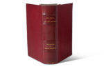 gros grains, dos à nerfs titré et daté or, double filet doré sur les coupes, coiffes ornées, tranches dorées sur témoins, gardes de soie moirée rouge, contreplats ornés d'un encadrement de 9 filets dorés, couvertures et dos conservés, étui (reliure signée H. Blanchetière). EXEMPLAIRE RARE, et UNIQUE d'après la dédicace autographe du fauxtitre, signé par l'auteur (signature humide à l'encre noire à la justification). Non numéroté, cet exemplaire sur JAPON BLANC SUPERNACRÉ contient un dessin original aquarellé de Charles Fouqueray contrecollé en début de volume, les cuivres in et hors-texte par et d'après dessins du même, un état en noir avec remarque et une suite de toutes les planches. TRÈS BEL EXEMPLAIRE. (Dos insolé et légèrement frotté, étui accidenté).[MARINE] - FOUQUERAY Charles (1869-1956) - CHACK Paul (1876-1945) On se bat sur mer Paris, Les Éditions de France, 1930. Large in-4 (335 x 270 mm), [2] bl. ff.-covers-bl. f.-[1] f.-false-title-title-frontispice-315 pp.-174 pl. full red morocco, spine ribbed, titled and dated in gold, double gilt fillet on the edges, gilt edges on witnesses, red moiré silk endpapers, counterpanes with 9 gilt fillets, covers and spine preserved, slipcase (binding signed H. Blanchetière). RARE, and UNIQUE copy according to the autograph dedication on the false title, signed by the author (wet signature in black ink on the justification). Not numbered, this copy on SUPERNACROUS WHITE JAPON contains an original watercoloured drawing by Charles Fouqueray pasted on the front cover, the copperplates in and out of the text by and after drawings by the same author, a state in black with remarks and a suite of all the plates. VERY GOOD EXAMPLE. (Spine unstained and slightly rubbed, case damaged).