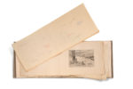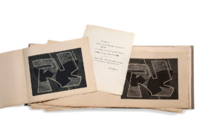 toile beige titrée au dos. Édition originale de cet hommage au graveur parisien Rogelio Lacourière avec un texte de Pablo Picasso: «Aux quatre coins de la pièce». Exemplaire illustré de 13 eaux-fortes ou pointes-sèches hors-texte à pleine page, dont 3 en couleurs, et portant les signatures autographes de BEAUDIN, BRYEN, DUNOYER DE SEGONZAC, ERNST, MASSON, MIRO, PICASSO, SURVAGE, ... Tirage à 75 exemplaires numérotés, celui-ci un des 50 sur vieux japon, signé par Iliazd à la justification (n°10). Est joint un exemplaire du bon à tirer de la gravure de MAGNELLI accompagné d'une note explicative de Louis BARNIER (1 p. à l'encre). Très bel exemplaire.Rogelio Lacourière copper fisherman Paris, Le Degré Quarante et un [Iliazd], 1968. In-4 oblong (266 x 335 mm), in sheets, soft vellum cover with wide flaps titled on the front cover, hard beige cloth folder titled on the spine. First edition of this tribute to the Parisian engraver Rogelio Lacourière with a text by Pablo Picasso: "Aux quatre coins de la pièce". Copy illustrated with 13 full-page etchings or drypoints, 3 of which are in colour, and bearing the autograph signatures of BEAUDIN, BRYEN, DUNOYER DE SEGONZAC, ERNST, MASSON, MIRO, PICASSO, SURVAGE, ... Edition at 75 numbered copies, this one of the 50 on old japon, signed by Iliazd at the justification (n°10). Attached is a copy of the print order of the engraving by MAGNELLI with an explanatory note by Louis BARNIER (1 p. in ink). A very nice copy.