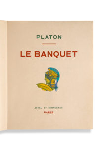 LAURENT Sébastien (1887-1973) - [PLATON]Le Banquet Paris, Javal et Bourdeaux, 1928. In-4 (295 x 242 mm), en feuilles, couverture imprimée rempliée, emboîtage de maroquin rouge de l'éditeur. Frontispice gravé sur bois par Camille Beltrand et...
