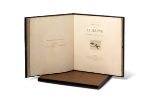 l'atelier Devauchelle. Édition originale de l'un des tout premiers livres de peintre et du premier ouvrage illustré par Manet. Illustrée de 8 eaux-fortes originales d'Édouard Manet. Tirage à 100 exemplaires, tous sur papier de Hollande, signés à la plume par l'auteur et le peintre (celui-ci n°23). «Le Fleuve est le premier livre de dialogue, Manet est l'artiste qui vient en personne, sans souci de délégation, se mêler de l'illustration d'un livre, il inaugure une pratique» (PEYRÉ Yves, Peinture et poésie. Le dialogue par le livre. Gallimard, 2001, p.103). Exceptionnel et rare exemplaire tel que paru, à toutes marges. PROVENANCE Collection Fred Feinsilber (ex-libris); «JAB» (ex-libris composé sur fond rouge). RÉFÉRENCES CHAPON François, Le Peintre et le livre, 1987, p.16; The Artist and the Book, 1860-1960. Boston, 1961, n°177. (Marges effrangées, très légères piqures éparses; légers frottements au dos de la boîte-étui).Le Fleuve. Eaux-fortes by Édouard Manet Paris, Librairie de l'Eau-forte, 1874. In-4 (280 x 240 mm), 15 pp. in sheets, printed cover under crystal paper, untrimmed, in a box-sleeve from the Devauchelle workshop. Original edition of one of the very first painter's books and the first work illustrated by Manet. Illustrated with 8 original etchings by Édouard Manet. Edition of 100 copies, all on Hollande paper, signed in pen by the author and the painter (this one n°23). "Le Fleuve is the first book of dialogue, Manet is the artist who comes in person, without concern for delegation, to meddle with the illustration of a book, he inaugurates a practice" (PEYRÉ Yves, Peinture et poésie. Le dialogue par le livre. Gallimard, 2001, p.103). An exceptional and rare copy as issued, with full margins. PROVENANCE Collection Fred Feinsilber (bookplate); "JAB" (bookplate composed on red background). REFERENCES CHAPON François, Le Peintre et le livre, 1987, p.16; The Artist and the Book, 1860-1960. Boston, 1961, n°177. (Margins faded, very slight spotting; slight rubbing to the spine of the slipcase).