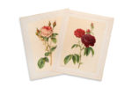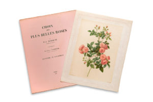 Japon. En feuilles, couverture imprimée à rabats, sous chemise imprimée rose de l'éditeur à lacets titrée «La Rose». Très belle édition au tirage limité de 102 exemplaires numérotés. L'un des 99 exemplaires (celui-ci n°11) comportant une suite des planches sur papier nacré du Japon. Avant-propos écrit par J.L Vaudoyer, imprimé sur vergé rose, dans lequel il présente la vie et l'oeuvre de P.J Redouté (1759-1840), «le Raphaël des fleurs». 12 très belles planches en couleurs tirées sur vélin de Rives par Mourlot d'après Pierre-Joseph Redouté, ainsi que la suite des 12 planches sur Japon. La mention «Souvenir de Bagatelle» fait référence à l'Exposition de la Rose au pavillon de Bagatelle où, comme écrit dans la justification de l'ouvrage, l'exemplaire n°1 de ce tirage a été présenté en hommage à S.M la Reine d'Angleterre. L'on joint: REDOUTÉ P.-J., Choix des plus belles roses. Nouvelle série de douze roses. Paris, 1951. In-folio, en feuilles, sous couverture imprimée à rabats. Série de 12 planches lithographiées sur vélin par Mourlot frères, numérotées de XIII à XXIV, accompagnée d'1 planche spécimen numérotée XI. Le bulletin de souscription à l'album de 1938 est joint. PROVENANCE Bibliothèque Horace FinalyChoice of the most beautiful roses. Souvenir de Bagatelle Paris, [Librairie Denis], 1938. In-folio (420 x 330 mm), 12 off-text lithographed plates on vellum and 12 on Japon. In leaves, printed cover with flaps, in a pink printed publisher's lace-up folder titled "La Rose". A very fine edition with a limited edition of 102 numbered copies One of the 99 copies (this one n°11) including a suite of plates on pearly paper from Japan. Foreword written by J.L Vaudoyer, printed on pink laid paper, in which he presents the life and work of P.J Redouté (1759-1840), "the Raphael of flowers". 12 very beautiful colour plates printed on Rives vellum by Mourlot after Pierre-Joseph Redouté, as well as the continuation of the 12 plates on Japon. The mention "Souvenir de Bagatelle" refers to the Exhibition of the Rose at the Bagatelle Pavilion where, as written in the justification of the work, the copy n°1 of this edition was presented as a tribute to H.M. the Queen of England. Attached: REDOUTÉ P.-J., Choix des plus belles roses. New series of twelve roses. Paris, 1951. In-folio, in sheets, under printed cover with flaps. Series of 12 lithographed plates on vellum by Mourlot frères, numbered from XIII to XXIV, accompanied by 1 specimen plate numbered XI. The subscription form for the 1938 album is enclosed. PROVENANCE Horace Finaly Library