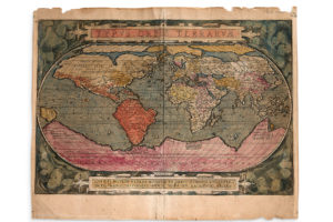 ORTELIUS Abraham (1527-1598)Typus orbis terrarum [1575]. Dimensions: 331 x 483 mm (carte); avec marges (400 x 500 mm). Gravure sur cuivre rehaussée de couleurs originales. PREMIÈRE VERSION (sur 3) de la mappemonde par Ortelius telle que parue dès...