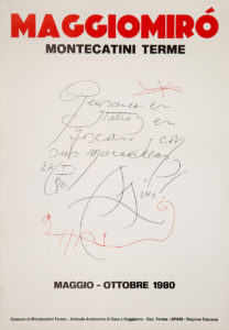 MIRO Joan (1893 - 1983)Affiche dédicacée au photographe Jesse Fernandez Stylo sur affiche de l'exposition Maggiomiro, tenue en 1980 en Toscane 49.5 x 34.5 cm 1931/64 x 13 37/64 in. PROVENANCE Succession privée Jesse FernandezPoster dedicated to...