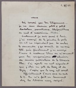 à Paul Chambrillon, mais n'ayant pu le joindre, " Je me suis tâté, puis finalement j'ai envoyé l'ours à madame Céline en m'excusant pour les comparaisons abusives des services publicitaires de la librairie Plon ". (ceux-ci ont certainement ont dû le comparer à Céline). Il se soucie bien évidemment des critiques passées et à venir, " A l'Express il y a du tirage. On me tire dessus à boulets rouges… Pas de style, pas d'imagination, auteur inculte […] je n'ai pourtant pas fait de tort à Cau ? ". Il demande à son destinataire son avis sur le roman, " et de toutes façons défends-moi dans ta sphère. J'ai besoin de tous les copains car j'ai l'impression que Cau ne sera pas le seul à me baver sur les rouleaux ". A la fin, une anecdote ne présage pas d'une bonne critique à venir : " Un pénible folliculaire figaroteux est venu m'interviouver chez Plon. Il voulait me photographier, je l'ai menacé de lui casser la gueule […] ".