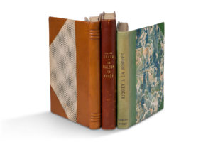 livre (celui-ci n° 1206) ; GRACQ Julien, Un balcon en forêt. Paris, Librairie José Corti, 1958. In-8, 253 pp. Demi-maroquin havane à coins, dos lisse titré or en long, couverture et dos conservés (reliure postérieure). Tirage à 300 exemplaires numérotés, celui-ci sur Alfama du Marais (n°193) ; GUICHARD-MELI Jean, La peinture, aujourd'hui. Entretiens avec Zack, Lapicque, Elvire Jan, [...]. S.l., bibliothèque de l'Homme d'action, 1960. In-8, 117 pp. Demi-veau blond à coins, dos à deux nerfs. Tirage limité à 50 exemplaires numérotés, celui-ci hors commerce (n° F) ; HESSE Raymond - BOFA Gus, Riquet à la houppe et ses compagnons. Paris, éd. Mornay, 1923. In-12, 161 pp. Demi-maroquin vert à coins, dos lisse titré estampé en long, couverture et dos conservés (reliure postérieure).[LITERATURE] Set of 4 books: BERNANOS Georges, L'Imposture. Paris, Plon, 1953. In-8, 309 pp. Publisher's titled boards. Copy out of trade. Limited edition of 5,000 numbered copies reserved for subscribers of the Club du meilleur livre (this one n° 1206) ; GRACQ Julien, Un balcon en forêt. Paris, Librairie José Corti, 1958. In-8, 253 pp. Half havana morocco with corners, smooth spine titled in gold throughout, cover and spine preserved (later binding). Edition at 300 numbered copies, this one on Alfama du Marais (n°193) ; GUICHARD-MELI Jean, La peinture, aujourd'hui. Interviews with Zack, Lapicque, Elvire Jan, [...]. S.l., Bibliothèque de l'Homme d'action, 1960. In-8, 117 pp. Half blond calf with corners, double spine. Limited edition of 50 numbered copies, this one out of trade (n° F) ; HESSE Raymond - BOFA Gus, Riquet à la houppe et ses compagnons. Paris, éd. Mornay, 1923. In-12, 161 pp. Green half-maroquin with corners, smooth spine with stamped titles, cover and spine preserved (later binding).