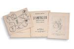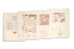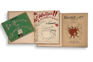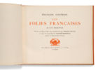 L. Guitry, Colette Willy, Otero, Cléo de Mérode, Yvette Guilbert, etc. L'un des 500 exemplaires sur vergé. - COUPERIN François, Les Folies françaises ou Les Dominos. Paris, Léon Pichon, 1920. In-8. Plein cartonnage entoilé orange, dos lisse avec pièce de titre de maroquin noir, couvertures conservées (reliure postérieure). Tirage à 440 exemplaires numérotés. L'un des 335 exemplaires sur vergé à la cuve Van Gelder Zonen (celui-ci n° 262). Bon exemplaire. - SENNEP Jean, 2 volumes reliés : Cartel et Cie. Caricatures inédites de J. Sennep. Paris, Bossard, 1926 (n°36 sur papier pur chiffon d'Auvergne) ; A l'Abattoir les Cartellistes !!.. Album-souvenir des Elections de 1928 par J. Sennep. Paris, Bossard, 1928 (n°3 sur Alfa). Couvertures conservées. - SENNEP Jean, La Guerre en chemise noire. Paris-Toulouse, Chantal, 1945. Couverture verte imprimée illustrée, avec sa note jointe concernant l'usage d'un léger vélin pour cette édition car manque de papier. - FERJAC Pol - MONIER Henri, Sans Tickets. A la corne d'abondance, 1942. Tirage limité à 780 exemplaires numérotés, celui-ci l'un des 750 sur vélin blanc supérieur (n°80). Volume relié, couv. conservée. - TORRES Henry - HINSBERGER, Notre Paris. Paris, Serg, 1963. Tirage limité à 4.075 exemplaires numérotés, celui-ci l'un des 3.900 sur alfa (n°234). Cartonnage d'édition. L'on joint : - BOFA Gus, 2 suites de planches refusées pour les Fables de Jean de La Fontaine (Paris, J. Terquem, 1928-1930). Tomes I et II. Suite de 26 planches pour le tome I et de 24 planches pour le tome II. Première est numérotée « 10/50 » et signée au crayon par l'artiste. Contenues dans une chemise demi-percaline bleue à coins, pièces de titre de maroquin noir au dos. - TOULOUSE-LAUTREC, Submersion. Album de quarante-neuf dessins inédits à la plume. Paris, Arts et métiers graphiques, 1938. Tirage à 200 exemplaires sur Arches, celui-ci n°5. Chemise à rabats et étui. PROVENANCE : Bibliothèque Horace Finaly[CARICATURISTS]. [ILLUSTRATIONS] - GEOFFROY Henry, Gestes et profils. Study by Urbain Gohier. Paris, Charles Davis, 1906. Publisher's percale. 36 portraits, notably of the Countess Mathieu de Noailles, Sardou, J. Claretie, Antoine, Cécile Sorel, L. Guitry, Colette Willy, Otero, Cléo de Mérode, Yvette Guilbert, etc. One of 500 copies on laid paper. - COUPERIN François, Les Folies françaises ou Les Dominos. Paris, Léon Pichon, 1920. In-8. Full orange cloth-covered boards, smooth spine with black morocco title-piece, covers preserved (later binding). Edition of 440 numbered copies. One of 335 copies on Van Gelder Zonen laid paper (this one n° 262). Good copy. - SENNEP Jean, 2 bound volumes : Cartel et Cie. Unpublished cartoons by J. Sennep. Paris, Bossard, 1926 (n°36 on pure Auvergne rag paper) ; A l'Abattoir les Cartellistes ! Album-souvenir des Elections de 1928 by J. Sennep. Paris, Bossard, 1928 (n°3 on Alfa). Covers preserved. - SENNEP Jean, La Guerre en chemise noire. Paris-Toulouse, Chantal, 1945. Green printed illustrated cover, with its attached note concerning the use of a light vellum for this edition because of lack of paper. - FERJAC Pol - MONIER Henri, Sans Tickets. A la corne d'abondance, 1942. Limited edition of 780 numbered copies, this one of the 750 on superior white vellum (n°80). Bound volume, cover preserved. - TORRES Henry - HINSBERGER, Notre Paris. Paris, Serg, 1963. Limited edition of 4,075 numbered copies, this one of the 3,900 on esparto (n°234). Publisher's boards. Attached : - BOFA Gus, 2 suites of plates refused for the Fables of Jean de La Fontaine (Paris, J. Terquem, 1928-1930). Volumes I and II. Suite of 26 plates for volume I and 24 plates for volume II. The first is numbered "10/50" and signed in pencil by the artist. Contained in a blue half-percaline folder with corners, black morocco title pieces on the spine. - TOULOUSE-LAUTREC, Submersion. Album of forty-nine unpublished pen-and-ink drawings. Paris, Arts et métiers graphiques, 1938. Edition at 200 copies on Arches, this one n°5. Flap folder and slipcase. PROVENANCE: Horace Finaly Library