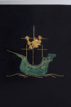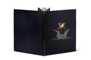 doré, rehaussé à la feuille d'or, représentant le bateau ornant la couverture d'édition, dos lisse titré or en long, tête dorée, couverture illustrée et dos conservés, gardes de papier marbré (reliure signée Loutte). Édition illustrée par Jean Charlot. Tirage à 895 exemplaires numérotés, celui-ci l'un des 800 exemplaires sur vélin d'Arches (n°276). Exemplaire magnifiquement relié. (Rousseurs éparses)Le Livre de Christophe Colomb, lyrical drama in two parts. Paris, NRF, 1933. In-4 (290 x 235 mm), 66 pp. Full midnight blue morocco, top board set with a gilt-stamped central motif, enhanced with gold leaf, representing the boat on the cover of the edition, smooth spine titled in gold throughout, gilt head, illustrated cover and spine preserved, marbled paper endpapers (binding signed Loutte). Illustrated edition by Jean Charlot. Edition of 895 numbered copies, this one of the 800 copies on Arches vellum (n°276). A beautifully bound copy. (Scattered brown spots)