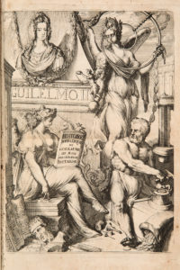 in-folio (310 x 210 mm), [2] ff. bl.-[4] ff.-232 pp. Plein veau granité, dos à nerfs orné de fleurons dorés, pièce de titre de maroquin rouge, roulette à motifs sur les coupes, tranches jaspées, gardes de papier marbré (reliure d'époque). Édition originale illustré d'un titre-frontispice allégorique, d'un second titre-frontispice et de 12 planches en pleine page hors-texte, le tout gravé à l'eau-forte par Romeyn de Hooghe, et près de 120 médailles gravées à l'eau-forte dans le texte. PROVENANCE : Bibliothèques de Daniel Appia ; et de Robert de Billy (ex-libris contrecollés sur contregarde). (Plusieurs cahiers brunis, légère déchirure angle supérieur sans altération p. 163 ; coiffes arrachées, trou sur mors).History of William III. King of England, Scotland, France, and Ireland, Prince of Orange, &c. [...]. By Medals, Inscriptions, Triumphal Arches, & other Public Monuments. Amsterdam, s. éd., 1692. Small folio (310 x 210 mm), [2] bl. ff.-[4] ff.-232 pp. full calf, spine ribbed and decorated with gilt fleurons, red morocco title-piece, marbled end-papers, marbled paper end-papers (contemporary binding). First edition illustrated with an allegorical title-frontispice, a second title-frontispice and 12 full-page plates off-text, all engraved in etching by Romeyn de Hooghe, and nearly 120 medals engraved in etching in the text. PROVENANCE: Libraries of Daniel Appia; and of Robert de Billy (bookplates pasted on the flyleaf) (Several quires browned, slight tear upper corner without alteration p. 163; headpieces torn off, hole on spine).