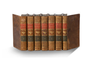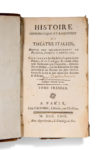 celles tant italiennes que françaises, données sur le théâtre, avec les anecdotes les plus curieuses et les notices les plus intéressantes de la vie et des talens des auteurs et acteurs. Paris, Lacombe, 1769. 7 volumes grand in-12. Plein veau marbré, dos lisse à caissons et fer doré, pièces de titre de maroquin à grain long rouge, pièces de tomaison de maroquin vert à grain long vert, tranches marbrées. Édition originale. (Quelques manques aux reliures, frottements).[THEATRE] Anecdotal and reasoned history of the Italian theatre, from its re-establishment in France to the year 1769. Containing the analyses of the principal plays and a catalogue of all those, both Italian and French, given on the theatre, with the most curious anecdotes and the most interesting notices of the life and talents of the authors and actors. Paris, Lacombe, 1769. 7 volumes large in-12. Full marbled calf, smooth spine with gilt caissons and iron, red long-grained morocco title-pieces, green long-grained morocco tomato-pieces, marbled edges. Original edition. (Some damage to bindings, rubbing).
