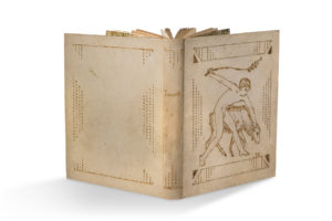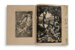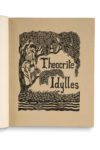 supérieur d'un motif pyrogravé par Drouart (adolescent et mouton) et de divers ornements, signée de ses initiales, dos lisse titré et orné, gardes de papier marbré, couverture et dos conservés. Exemplaire unique illustrée de 95 bois originaux de Raphaël Drouart, dont 20 grand bois hors-texte, et comportant, reliés en fin de volume: une suite des planches sur chine, une suite de leurs contre-épreuves sur vélin mince chamois, certains monogrammés au crayon par Drouart, 3 épreuves d'artiste sur japon mince numérotés « 1/5 », un monotype sur vélin fort et le prospectus-annonce. Tirage à 320 exemplaires numérotés. Un des 20 exemplaires hors-commerce sur papier Whatman réservés à l'artiste (celui-ci n° VIII) signé par l'éditeur. Bel et frais exemplaire (malgré quelques piqures à la reliure). PROVENANCE : Cahout (ex-libris contrecollé sur contregarde).Les Idylles translated by Leconte de Lisle and illustrated with 92 original woodcuts by Raphaël Drouart. Paris, Gaston Boutitie, s. d. [1920]. In-4 (286 x 233 mm), 202 pp. Bound in vellum with a pyrographed motif by Drouart (adolescent and sheep) and various ornaments on the upper cover, signed with his initials, smooth titled and decorated spine, marbled paper endpapers, cover and spine preserved. A unique copy illustrated with 95 original woodcuts by Raphaël Drouart, including 20 large woodcuts, and including, bound at the end of the volume: a suite of plates on chine, a suite of their proofs on thin chamois vellum, some of which are monogrammed in pencil by Drouart, 3 artist's proofs on thin japanese paper numbered "1/5", a monotype on strong vellum, and the prospectus-announcement. Edition of 320 numbered copies. One of the 20 off-market copies on Whatman paper reserved for the artist (this one n° VIII) signed by the publisher. A fine and fresh copy (despite some pitting to the binding). PROVENANCE: Cahout (ex-libris pasted on counterguard).
