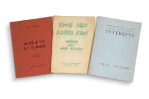 dessins: au verso du titre (« Forme de femme avec grille ») et un cul-de-lampe. L'un des 50 exemplaires sur papier Featherweight, au tirage non précisé. (Très bon état général) L'on joint : -ÉLUARD Paul, Quelques-uns des mots qui jusqu'ici m'étaient mystérieusement interdits, Paris, G L M, 1937. Plaquette d'édition in-12, couverture imprimée bleue. Édition originale. Un des 45 exemplaires sur normandy vellum (celui-ci n° 38). Belle typographie. Très bon état. -ÉLUARD Paul, Comme deux gouttes d'eau. Paris, Éditions Surréalistes, 1933. Plaquette d'édition in-12, couverture imprimée. Édition originale. Un des 175 exemplaires numérotés sur papier vert (celui-ci n° 11). Bon état général.Morality of sleep. Drawings by René Magritte. Antwerp, L'Aiguille aimantée, n. d. [1941]. In-12 (185 x 138 mm), [4] ff. Publisher's booklet, red printed cover. Original edition illustrated with 2 reproductions of drawings: on the verso of the title ("Form of a woman with a grid") and a cul-de-lampe. One of 50 copies on Featherweight paper, edition not stated. (Very good general condition) Attached: -ÉLUARD Paul, Quelques-uns des mots qui jusqu'ici m'étaient mystérieusement interdits, Paris, G L M, 1937. Publisher's booklet in-12, blue printed cover. First edition. One of 45 copies on normandy vellum (this one n° 38). Beautiful typography. Very good condition. -ÉLUARD Paul, Comme deux gouttes d'eau. Paris, Éditions Surréalistes, 1933. Publisher's booklet in-12, printed cover. First edition. One of 175 numbered copies on green paper (this one n° 11). Good condition.