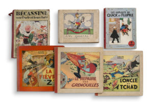 R., Les Aventures de Fripounet et Marisette. Le Repaire des grenouilles. Album Fleurus. 1952. Cartonnage d'édition ; BREYSSE F. A., L'Oncle du Tchad. Album Fleurus. 1952. Cartonnage d'édition ; HANSI Oncle - HUEN, Histoire d'Alsace racontée aux petits enfants. Paris, H. Floury, 1912. Cartonnage d'édition ; HERGÉ, Exploits de Quick et Flupke. 4e série. [Belgique], Casterman, 1951. Cartonnage d'édition ; DAUCHEZ André - MUSSET Paul de, Monsieur le Vent et Madame la Pluie. Paris, Flammarion, 1948. Cartonnage d'édition ; PINCHON J.-P. - CAUMERY, Bécassine, son oncle et leurs amis. Paris, Gautier et Languereau, 1926. Cartonnage d'édition ; SCHALIER Charlotte, En guerre. Paris, Berger-Levrault, s.d. Cartonnage d'édition. (État d'usage avec quelques dos détachés).[ENFANTINA] Set of 8 books for children BLANCHARD Pierre, Les Accidens de l'Enfance. Paris, Lehuby, 1838. Vintage binding; BONNET R., Les Aventures de Fripounet et Marisette. La Fièvre "Z". Fleurus album. Publisher's hardback; BONNET R., Les Aventures de Fripounet et Marisette. Le Repaire des grenouilles. Fleurus album. 1952. Publisher's hardback; BREYSSE F. A., L'Oncle du Tchad. Fleurus album. 1952. Hardcover; HANSI Oncle - HUEN, Histoire d'Alsace racontée aux petits enfants. Paris, H. Floury, 1912. Hardcover; HERGÉ, Exploits de Quick et Flupke. 4e série. [Belgium], Casterman, 1951. Hardcover; DAUCHEZ André - MUSSET Paul de, Monsieur le Vent et Madame la Pluie. Paris, Flammarion, 1948. Hardcover ; PINCHON J.-P. - CAUMERY, Bécassine, son oncle et leurs amis. Paris, Gautier et Languereau, 1926. Printed in hardback; SCHALIER Charlotte, En guerre. Paris, Berger-Levrault, s.d. Publisher's boards. (Condition of use with some spines detached).
