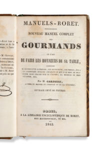 [GASTRONOMIE] - CARDELLI M., Nouveau manuel complet des gourmands ou l'art de faire les honneurs de sa table, [...]. Paris, Roret, 1842. Grand in-16, 280 pp. Demi-veau blond, plats avec filets dorés sur les bords du cartonnage, dos lisse orné,...