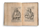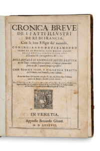 Bernardo Giunti, 1588. In-4 (302 x 224 mm), [4] ff., 62 planches gravés sur cuivre. Demi-basane havane, remontage moderne des plats, dos lisse orné, pièce de titre de maroquin rouge, tranches jaspées bleues. Édition originale de cette galerie de portraits de rois de France, et premier tirage des gravures attribuées à F. Franco. Chaque portrait est accompagné de 2 légendes gravées, en français et en italien. Le portrait de Charles Martel est ici absent. (Nombreuses rousseurs ; reliure accidentée, trou au dos, cartons des plats usés, dos cassé, premiers feuillets déreliés).[HISTORY] Cronica breve de i fatti illustri de re di Francia, Con le loro Effigie dal naturale, cominciando da Faramondo primo re di Francia, che regno l'anno della nostra salute CCCCXX. sino à Henrico III che regna hora del 1588 [...] Venetia, Bernardo Giunti, 1588. In-4 (302 x 224 mm), [4] ff., 62 copper-engraved plates. Half tan basane, modern binding, smooth spine decorated, red morocco title-piece, blue speckled edges. First edition of this gallery of portraits of French kings, and first printing of the engravings attributed to F. Franco. Each portrait is accompanied by 2 engraved captions, in French and in Italian. The portrait of Charles Martel is absent here. (Numerous freckles; binding damaged, hole in spine, boards worn, spine broken, first few leaves unbound).