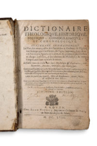 dictionnaire tant estimé à l'époque, qui connaîtra près d'une dizaine d'éditions au cours du XVIIe siècle. (Fort état d'usage).Dictionnaire théologique, historique, poétique, cosmographique et chronologique [...] Rouen, Jean Viret, 1658. Large in-8 (245 x 175 mm). Contemporary brown basane, spine titled and decorated. Sixth edition of this dictionary so highly regarded at the time, which will know nearly a dozen editions during the 17th century. (Strong condition of use).