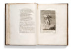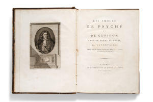 maroquin rouge, roulettes en encadrement des plats, roulette sur les coupes, tranches dorées, gardes de papier marbré, signet conservé (reliure d'époque). Premier tirage du portrait de La Fontaine gravé par Audouin d'après Hyacinthe Rigaud, et des 8 compositions de Moreau le jeune gravées par Dambrun, Duhamel, Dupréel, de Ghendt, Halbou, Petit et Simonet. Imprimé sur papier vélin, cet exemplaire a conservé toutes ses marges (env. 302 × 232 mm), ce qui est peu commun. (Reliure abîmée avec épidermures et coiffe et mors supérieurs abîmés). PROVENANCE : Bibliothèque Horace FinalyLes Amours de Psyché et de Cupidon, avec le Poème d'Adonis Paris, Didot le Jeune, an III [1795]. In-4 (304 x 235 mm), [4] ff.-234 pp. full marbled calf, smooth spine decorated with gilt fleurons, red morocco title-piece, gilt edges, marbled paper end-papers, bookmark preserved (contemporary binding). First printing of the portrait of La Fontaine engraved by Audouin after Hyacinthe Rigaud, and of the 8 compositions by Moreau le jeune engraved by Dambrun, Duhamel, Dupréel, de Ghendt, Halbou, Petit and Simonet. Printed on vellum paper, this copy has retained all its margins (ca. 302 × 232 mm), which is uncommon. (Binding damaged with epidermis and upper spine and headbone damaged). PROVENANCE: Horace Finaly Library