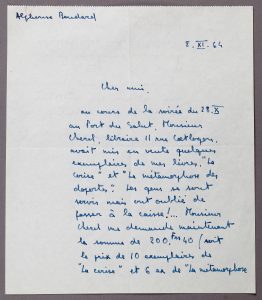 2 premiers romans de Boudard. " Les gens se sont servis mais ont oublié de passer à la caisse !…". Le libraire lui réclame de l'argent, il demande à Paul Chambrillon de régler la question, " envous remerciant, cher ami, et avec mes salutations de plus en plus distinguées ".